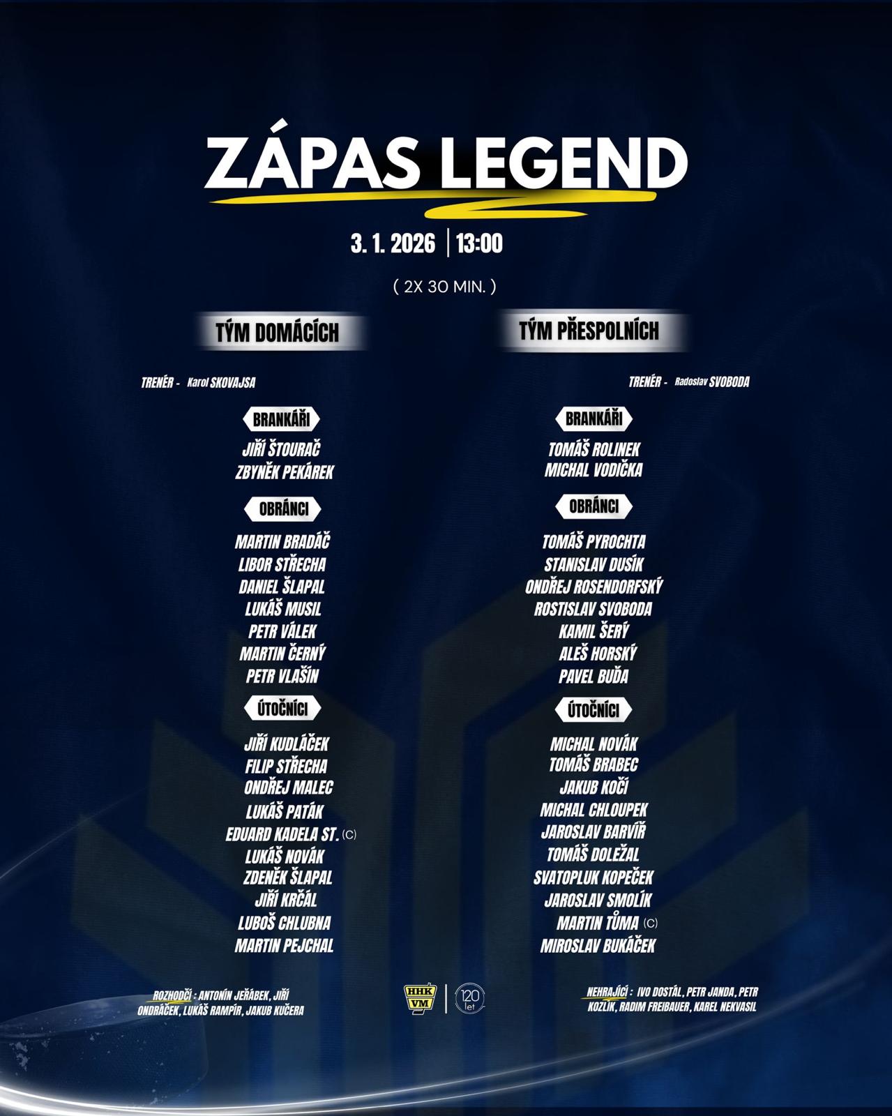 Hráči byli pro utkání legend rozděleni na Tým domácích a Tým přespolních. Tým domácích do zápasu povede bývalý velkomeziříčský brankář a později trenér Karol Skovajsa, který v památné sezóně 1999/2000 vychytal Velkému Meziříčí postup z KP 2 do KP 1. Tým přespolních bude koučovat mistr světa z Prahy (1985) Radoslav Svoboda, který byl hlavním trenérem při velkomeziříčském postupu do II. ligy v sezóně 2005/2006.