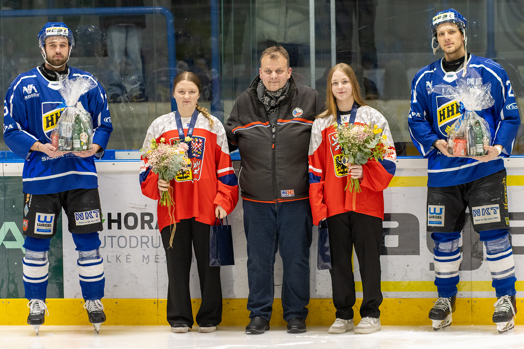 Druholigové utkání s Valašským Meziříčím začalo gratulacemi našim juniorským bronzovým medailistkám Amálii Karáskové a Monice Antalíkové.